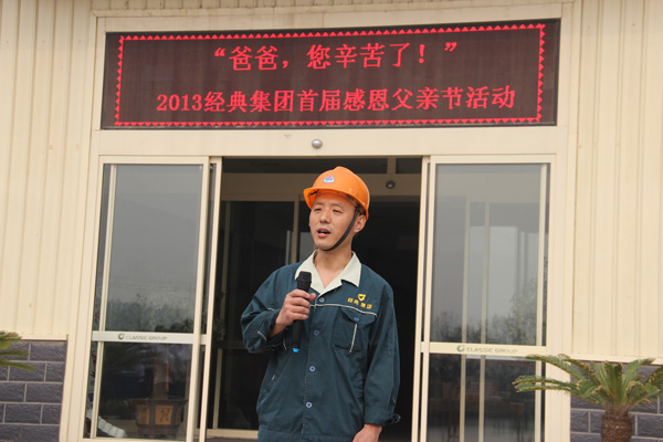 2013年6月16日上午7點(diǎn)30分,經(jīng)典集團(tuán)開(kāi)展2013年度父親節(jié)“送溫暖,獻(xiàn)愛(ài)心”活動(dòng),為集團(tuán)全體員工的父親送上愛(ài)心手機(jī),千元節(jié)日紅包,集團(tuán)董事長(zhǎng)苗樹(shù)文,總經(jīng)理杜福生及高層領(lǐng)導(dǎo)先后致辭并發(fā)放獎(jiǎng)金及手機(jī)?;顒?dòng)舉行完后,經(jīng)典集團(tuán)總經(jīng)理杜福生親自到部分員工家中為員工父親送上集團(tuán)的問(wèn)候與節(jié)日祝福。