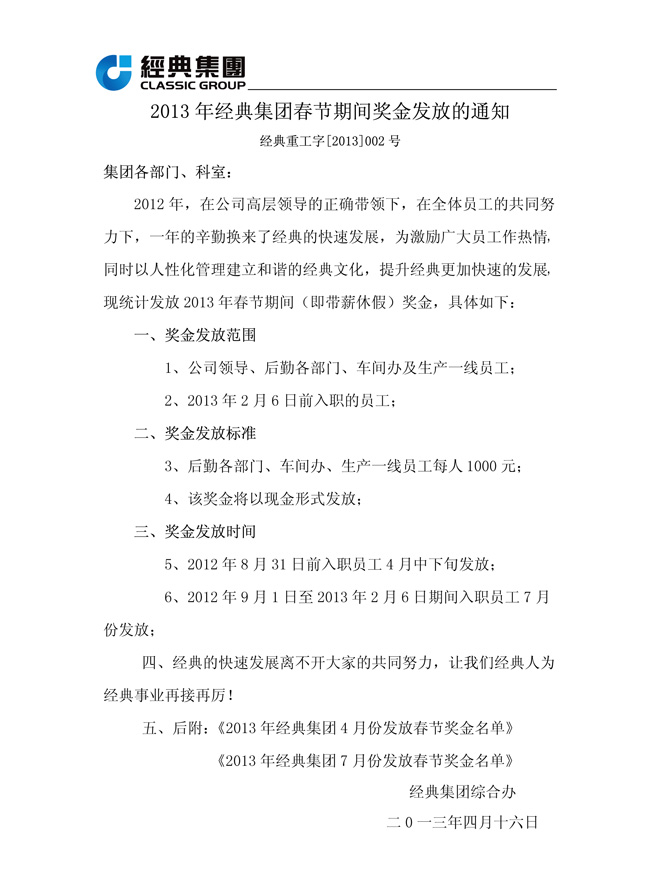 2013年經典集團春節期間獎金發放的通知