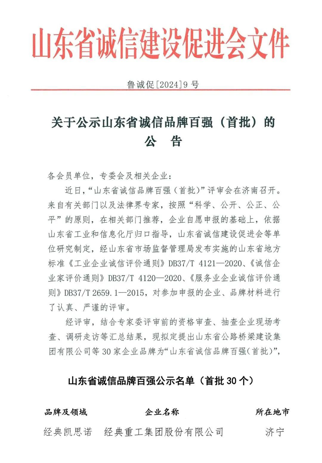 近日,山東省誠信建設促進會發(fā)布了《關于公示山東省誠信品牌百強(首批)的公告》,其中經(jīng)典重工集團股份有限公司“經(jīng)典凱思諾”品牌成功入選。